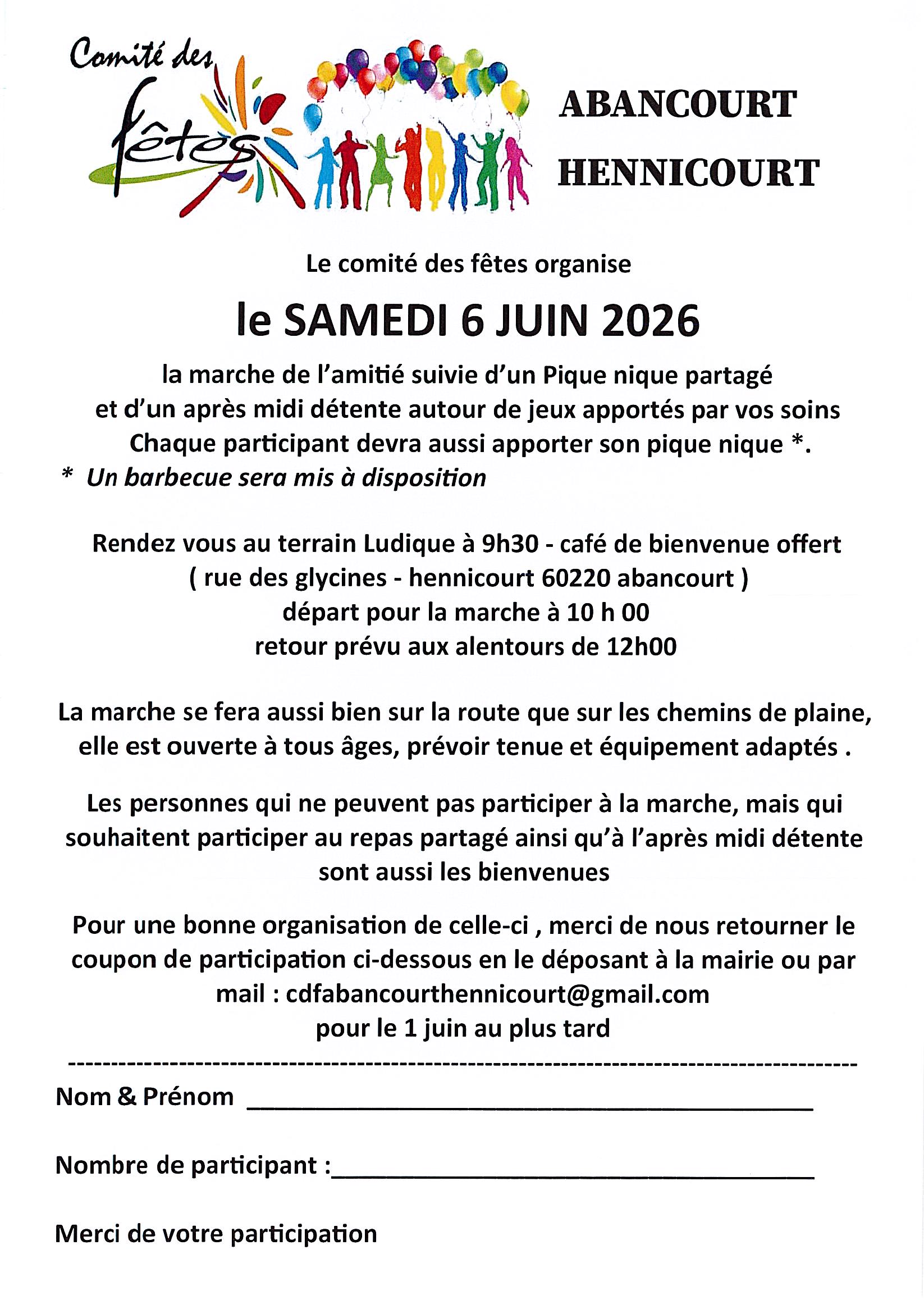 Pour une bonne organisation de celle-ci , merci de nous retourner le coupon de participation ci-dessous en le déposant à la mairie ou par mail : cdfabancourthennicourt@gmail.com