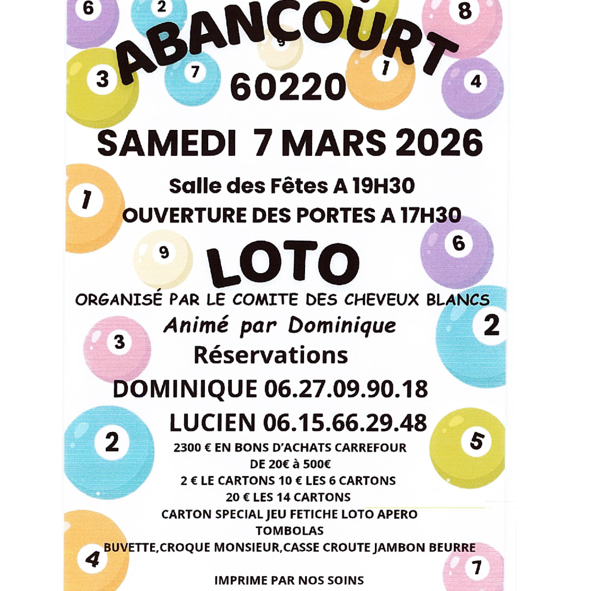 Réservations auprès de Dominique au 06 27 09 90 18 ou auprès de Lucien au 06 15 66 29 48