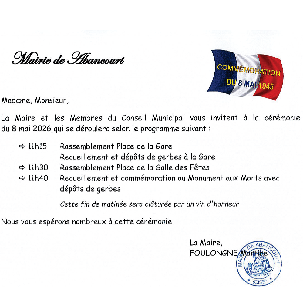 La Maire de Abancourt et les Membres du Conseil Municipal vous invitent à la cérémonie du 8 mai 2026 qui se déroulera selon le programme suivant :